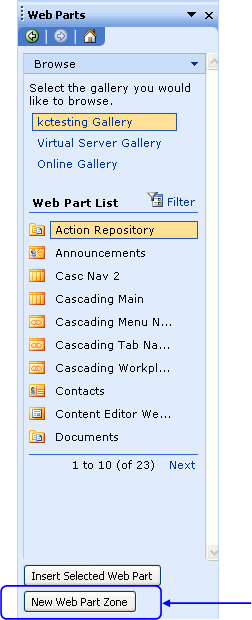 4. Click your mouse wherever you want the new web part zone to be created and then select the New Web Part Zone button at the bottom of the Web Parts task pane.